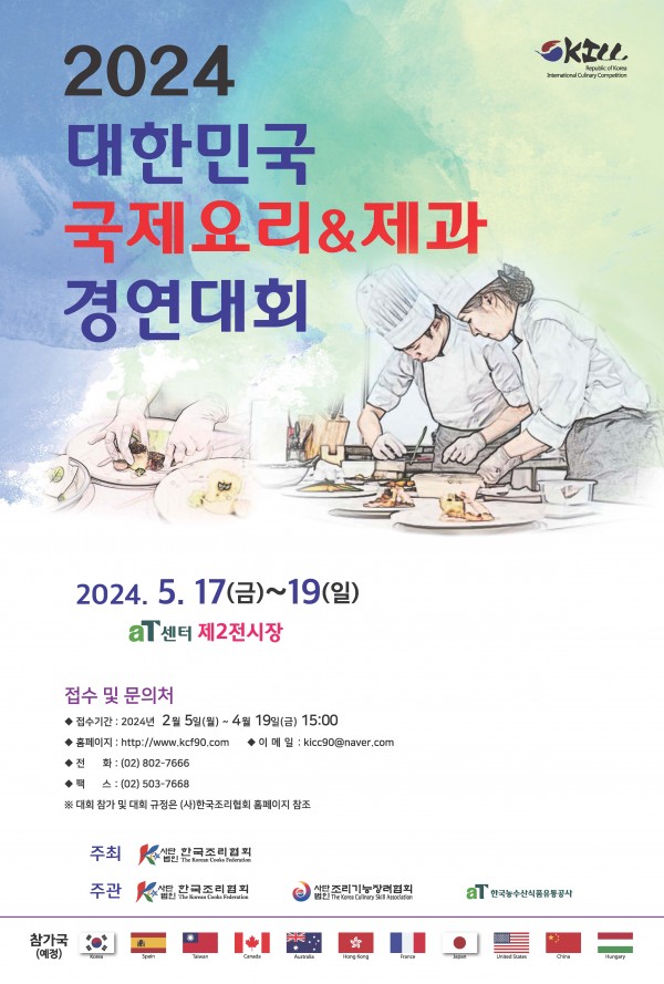 본문1. <대한민국 국제요리&제과 경연대회> 개요 (1) 대회일정 : 2024년 5월 17일(금) ~ 5월 19일(일) [3일간] (2) 대회장소 : aT센터 제2전시장(서울특별시 서초구 강남대로 27) (3) 접수기간 : 2024년 2월 5일(월) ~ 4월 19일(금) (4) 주 최 : 사단법인 한국조리협회 (5) 주 관 : 사단법인 한국조리협회, 사단법인 조리기능장려협회, aT한국농수산식품유통공사 2. 경연종목 - 대회참가신청 바로가기 : https://kcf90.com/competition/competition_list.html - 대회참가확인 바로가기 : https://kcf90.com/competition/competition_mypage.html - 문의처 : 이메일 kicc90@naver.com / 홈페이지 https://kcf90.com/bbs/board.php?bo_table=qa |